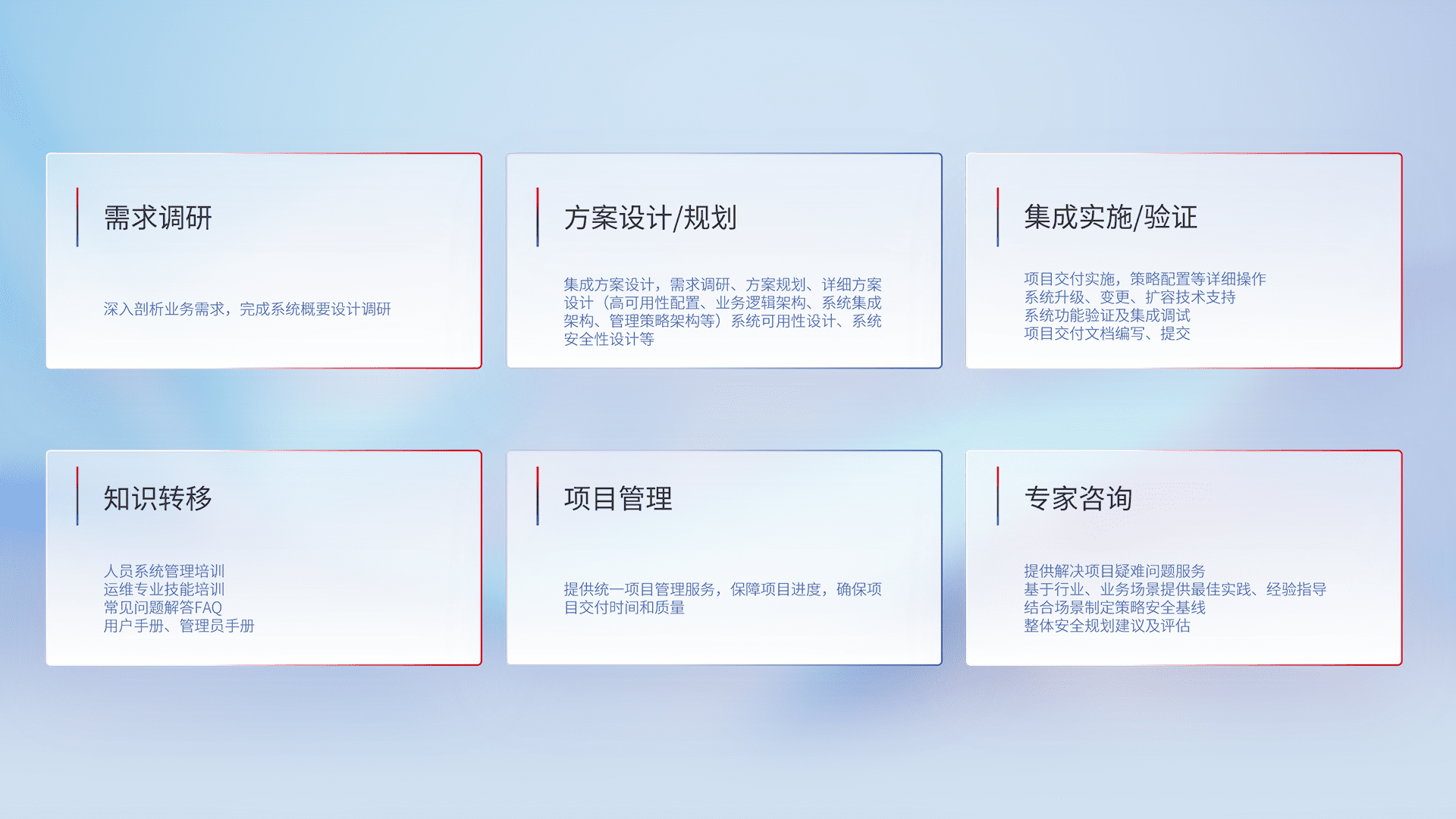 针对客户行业特性,,将宏观的安全战略和需求,,,通过专业的交付服务,,,实现项目落地,,,,为客户提供标准规范的集成交付服务。。。。